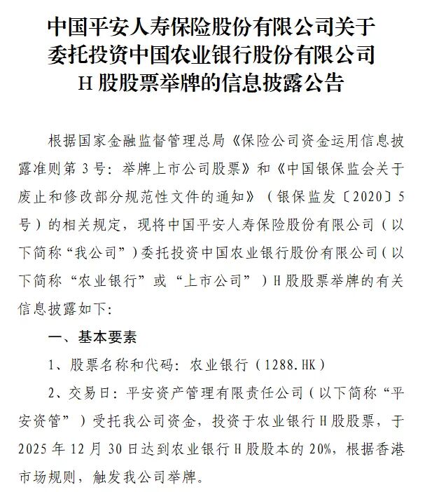 1月7日,平安人寿披露公告称,平安资管受托该公司资金,投资于农业银行H股股票,于2025年12月30日达到农业银行H股股本的20%。根据香港市场规则,触发举牌。